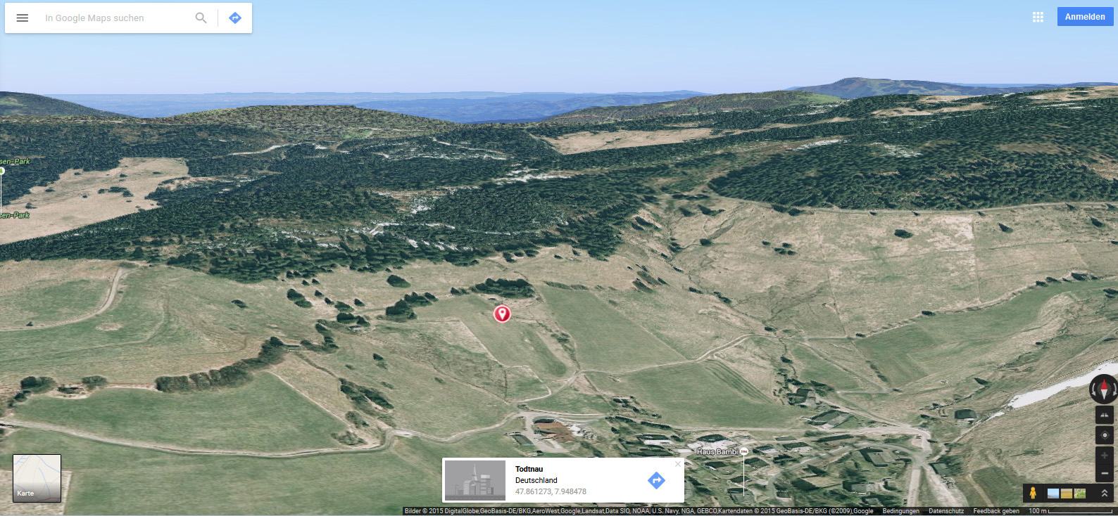 Vir­tu­el­ler Aus­flug zu Heid­eg­gers Hüt­te nähe Todt­nau­berg (Quel­le: Goog­le Maps inkl. Koor­di­na­ten)