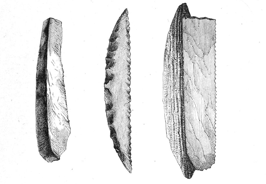 „Der Mensch hat in die ursprüng­li­chen Werk­zeu­ge die For­men sei­ner Orga­ne ver­legt oder pro­ji­cirt“ (Kapp 1877, S. 44f.). Laut Kapp unter­ma­len stein­zeit­li­che Werk­zeu­ge sei­ne The­se: Klei­ne Sägen und Boh­rer sind Zei­ge­fin­gern und Schnei­de­zäh­nen nach­emp­fun­den. (Illus­tra­tio­nen eben­falls aus Kapp 1877, S. 44)