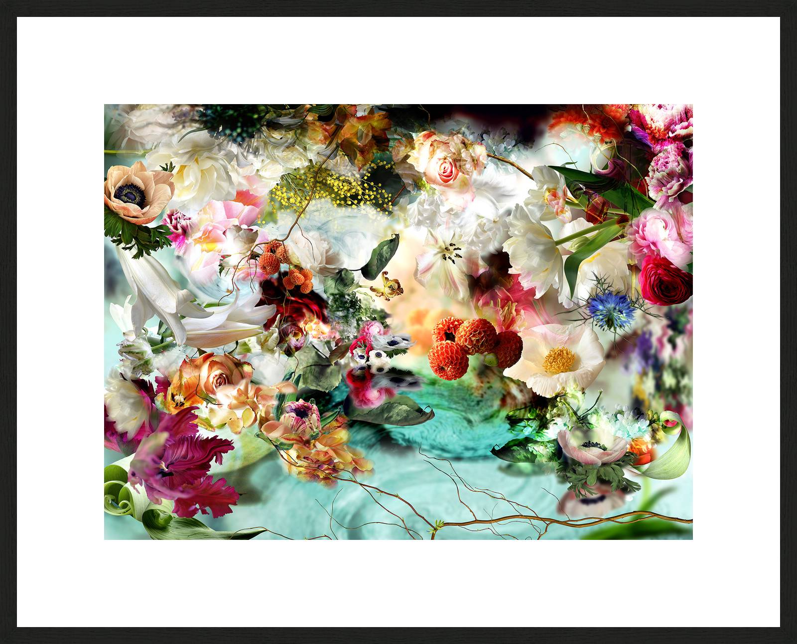 Vege­ta­ti­ons­for­men in Blau und Grün gehen durch das Gelb­rot der Eva-Gestalt hin­durch; ihr Kör­per scheint gewicht­los und durch­läs­sig. Zu ihren Füßen äst ein rotes Reh, den Kör­per geschmei­dig bie­gend. Ein brand­ro­ter Fuchs, in sei­ner Erd­höh­le gebor­gen, hebt neu­gie­rig sei­nen Kopf zum Reh auf. Rechts steht ein mas­si­ger Stier, rot leuch­tend im strah­lend blau­en Was­ser; er trinkt, den schwe­ren Nacken gebeugt. Dazwi­schen erscheint rot die Erde, die auf­grund ihrer inten­si­ven Kolo­rie­rung eine ähn­li­che Gewich­tung wie die Tie­re erhält.