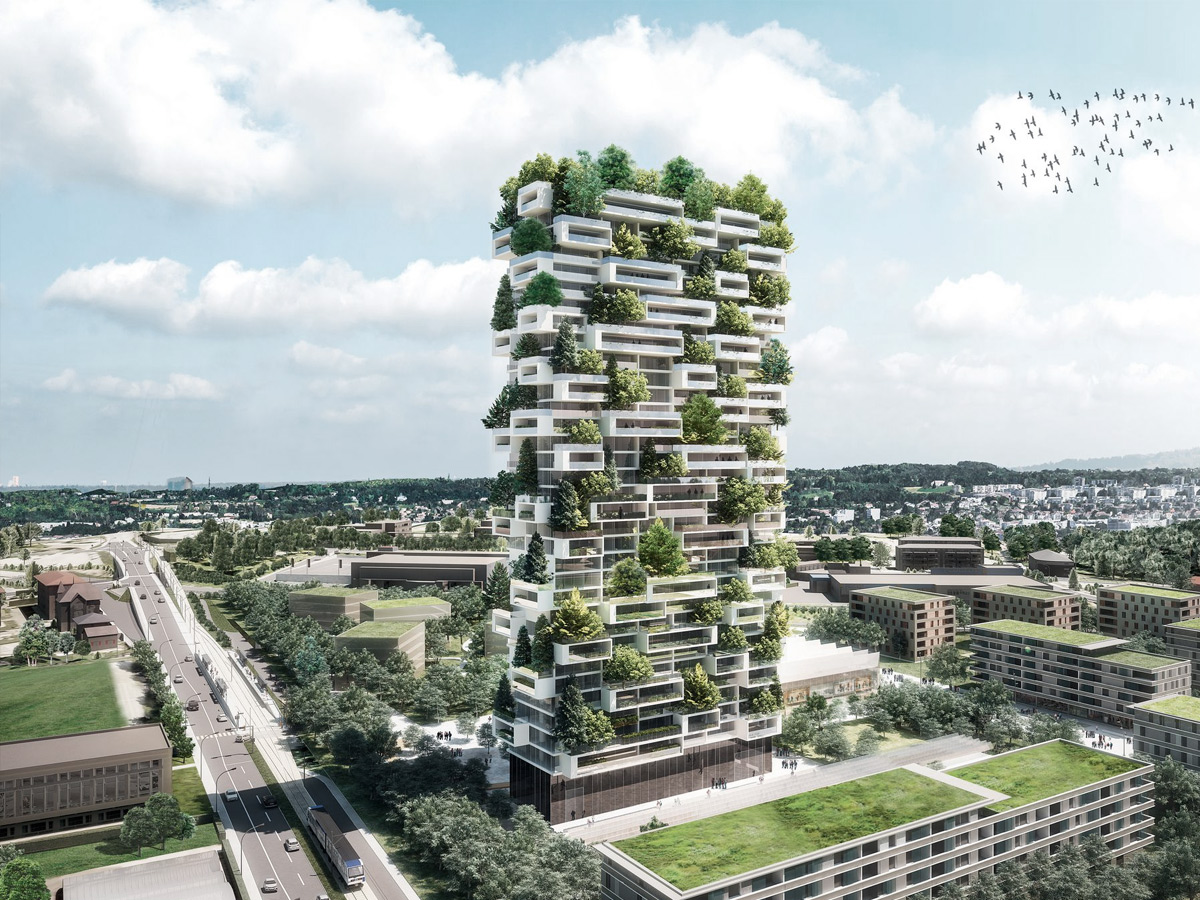 Seit 2015 wächst in Mai­land der Wald ver­ti­kal. Bosco Ver­ticale ist ein vom Archi­tek­ten Ste­fa­no Boe­ri ent­wor­fe­ner Wohn­kom­plex aus zwei Tür­men, 110 und 80 Meter hoch. Rund 800 Bäu­me, Tau­sen­de von Sträu­chern und Stau­den gedei­hen hier auf Bal­ko­nen und Ter­ras­sen. Ver­mark­tet wird der Kom­plex als Bei­trag zur öko­lo­gi­schen Stadt­er­neue­rung. Inmit­ten einer Stadt, die seit Jahr­zehn­ten ver­geb­lich gegen die Luft­ver­schmut­zung ankämpft, sol­len sich nun die kli­ma­ti­schen und ästhe­ti­schen Qua­li­tä­ten des Wal­des rei­ni­gend ent­fal­ten. In Lau­sanne baut Boe­ri mit dem Tour des Cèd­res einen wei­te­ren Wald­turm. In der chi­ne­si­schen Stadt Shi­jiaz­huang plant er gar eine gan­ze Forest City für 100.000 Menschen.