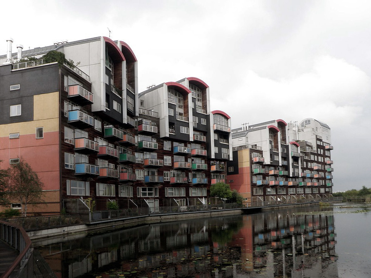 Das Lon­do­ner Dorf wirbt mit Parks, altem Baum­be­stand, natur­na­hen Gehöl­zen und See­ro­sen­tei­chen, bie­tet aber auch gan­ze Wohn­blocks mit zehn Eta­gen. Dage­gen ist die Bebau­ung beim Mart­has­h­of in Ber­lin-Prenz­lau­er Berg mit sei­nen Gar­den und Town Hou­ses klein­tei­li­ger. Das Mar­ke­ting setzt hier auf die Erneue­rung einer – sehr exklu­si­ven – Dorf­idyl­le. Hier herr­schen „Har­mo­nie“ und „Gemein­schaft“, es gibt „Frei­raum und Gebor­gen­heit“ und kei­ne „Angst vor der Ein­sam­keit oder einem Burn­out“. Die Men­schen fin­den ihr See­len­heil – auch öko­lo­gisch, mit all den Haus­be­grü­nun­gen, Holz­pel­let­hei­zun­gen und Regen­was­ser­auf­fang­sys­te­men. Kurz: „Bei­na­he eine Klos­ter­idyl­le“ (Zita­te in Rensch o.J.).