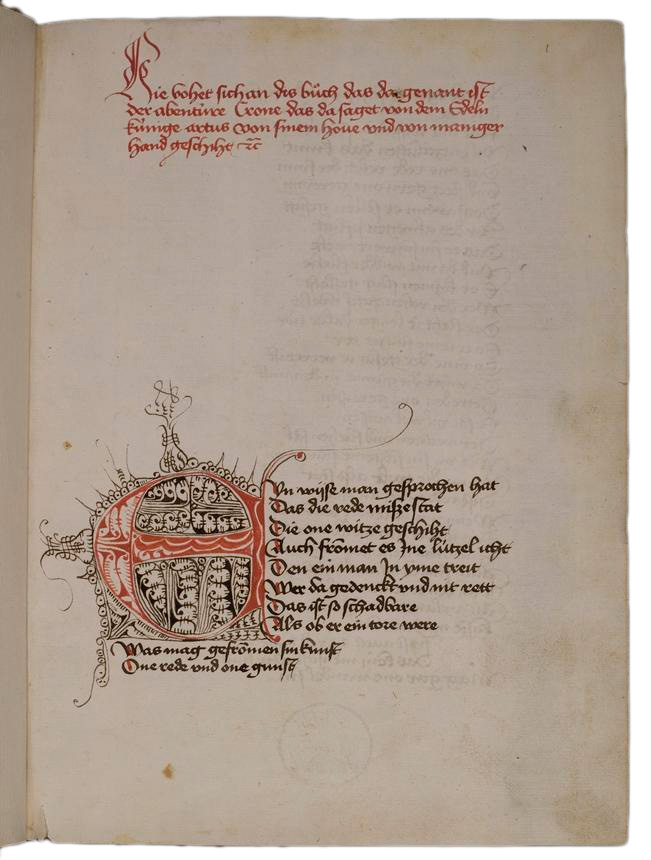Das sind – im mittelhochdeutschen Original – rund 80 Verse minutiöser Beschreibung eines Zungenkusses, wobei die Druck- und Rückzugsbewegungen des sich küssenden Pärchens (und man muss schon sehr genau hinschauen, um zu sehen, dass hier wirklich ‚nur‘ ein Kuss beschrieben wird!) so unmittelbar in den Rhythmus der Sätze übergehen, dass man geneigt ist, Theweleits Formulierung von der „Liebesverschlingung des Textkörpers“ schon für die Krone in Anspruch zu nehmen. Man muss nur probehalber einen Text wie das mittelalterliche Nonnenturnier danebenhalten: Der Penis eines von eigener Hand kastrierten Ritters findet sich wohlauf in einem Nonnenkloster wieder, dessen sonst so friedfertige Bewohnerinnen in wilde Kämpfe um den seltenen Gast entbrennen.